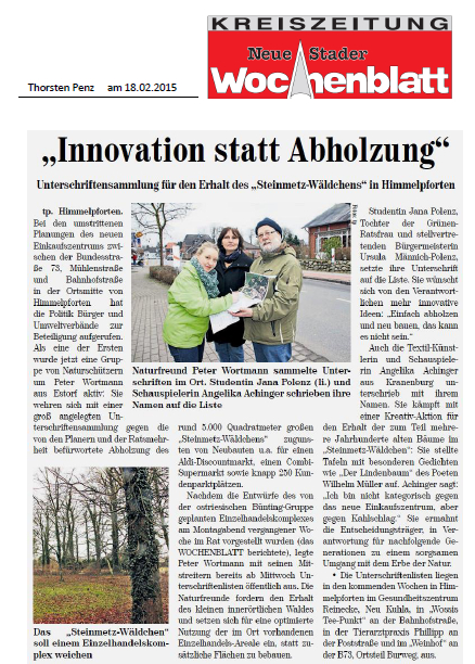 Auch wir sind daran interessiert, dass die Nahversorgung nachhaltig gesichert wird - in Himmelpforten und den umliegenden Gemeinden. Das übergroß geplante Einkaufszentrum würde andernorts für Leerstände sorgen und die BürgerInnen müssten per Auto einkaufen.